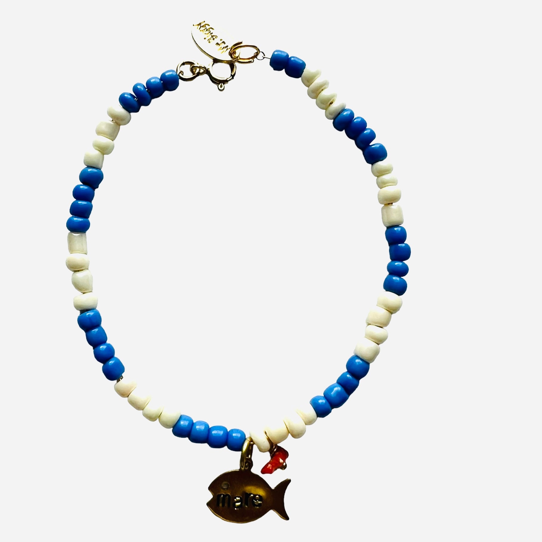bracciale MR BIGGY BIJOUX perline azzurre e bianco panna e ciondolo pescetto inciso a mano "mare"
