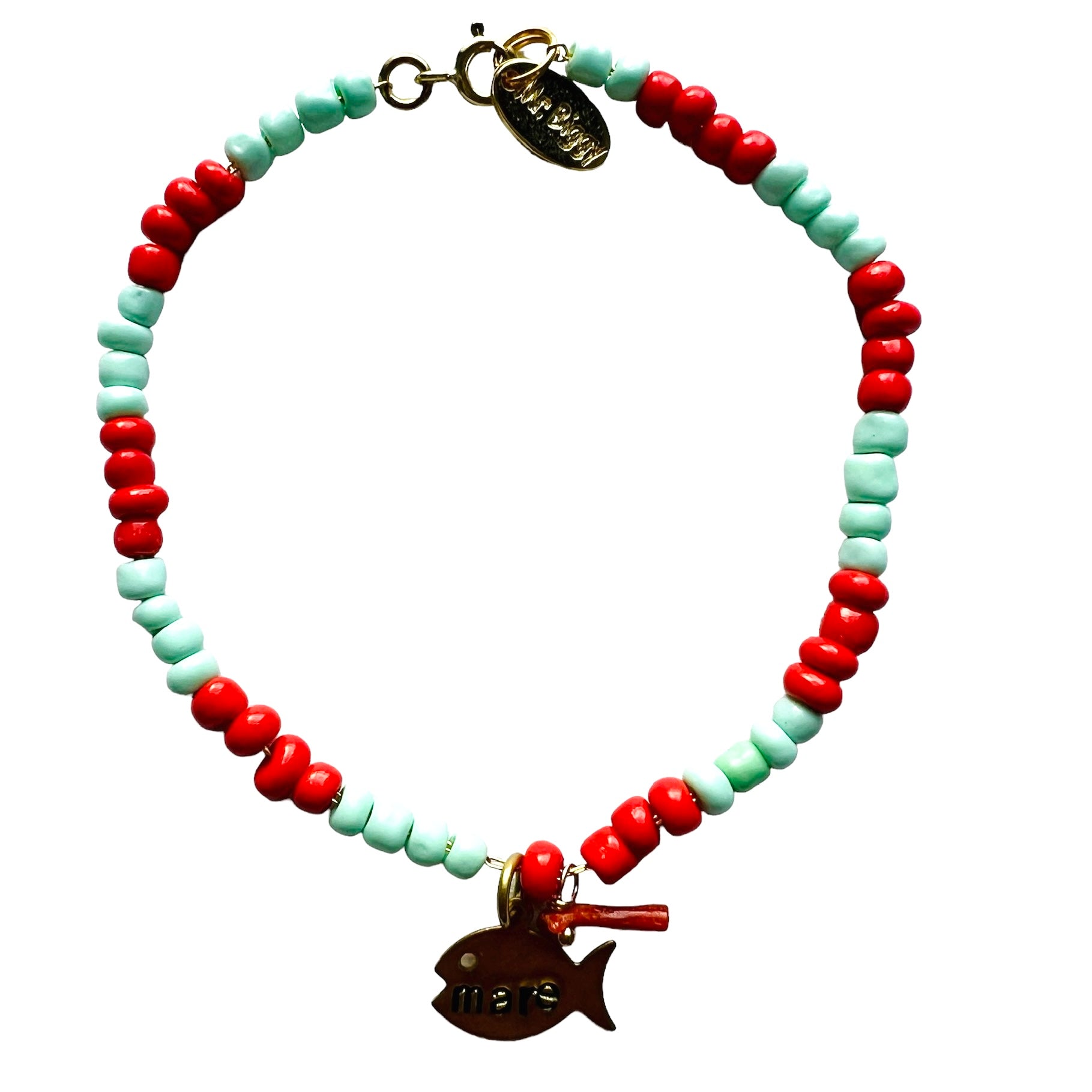 bracciale MR BIGGY BIJOUX perline verde acqua e rosso con ciondolo pescetto inciso a mano "mare"