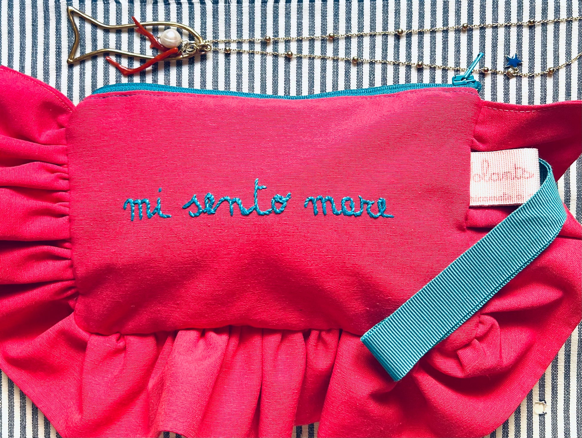 Bustina mille usi Volants Volant tela fucsia “mi sento mare” ricamata a mano