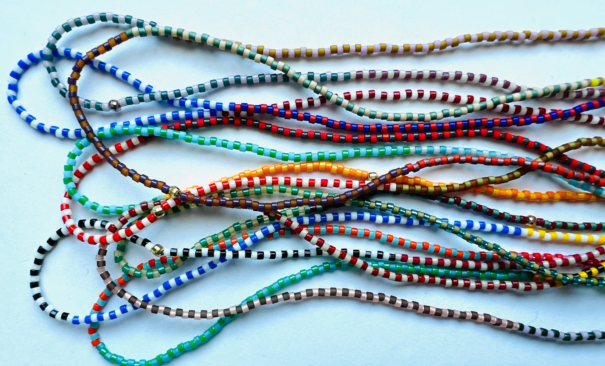 collana LESS. girocollo elastica in preziose perline di vetro giapponese mixate ad arte giallo, rosso, nero e marrone