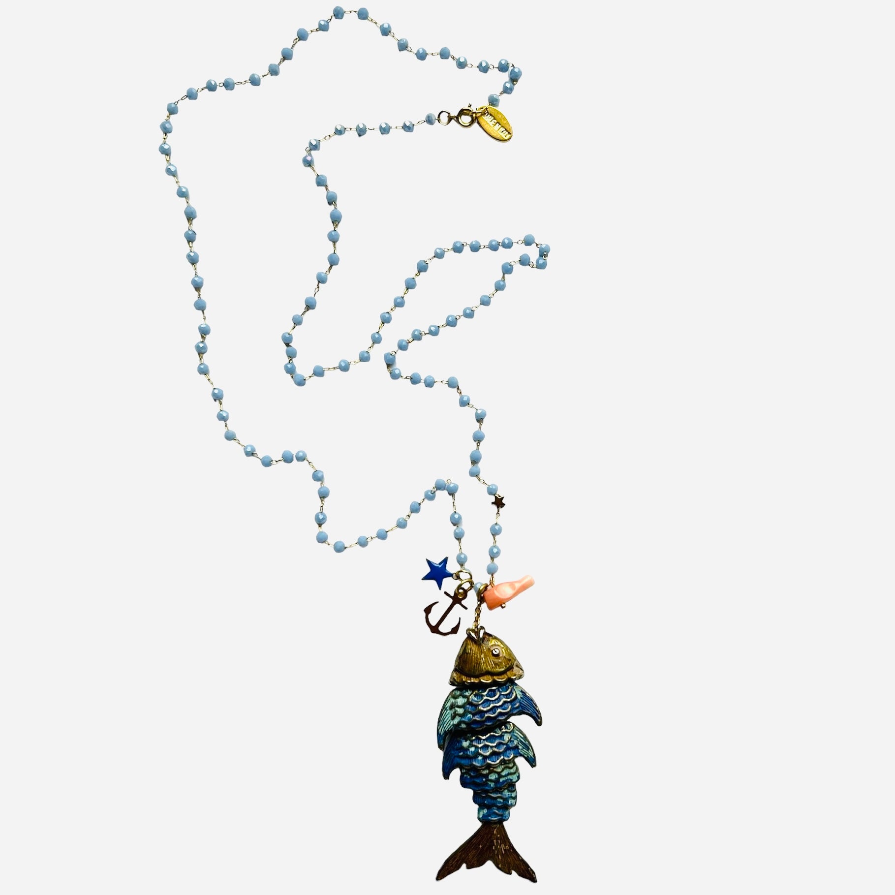 collana lunga MR BIGGY BIJOUX con cristalli lavorazione rosario celeste lavanda e ciondolo pesce snodato in smalto bluette