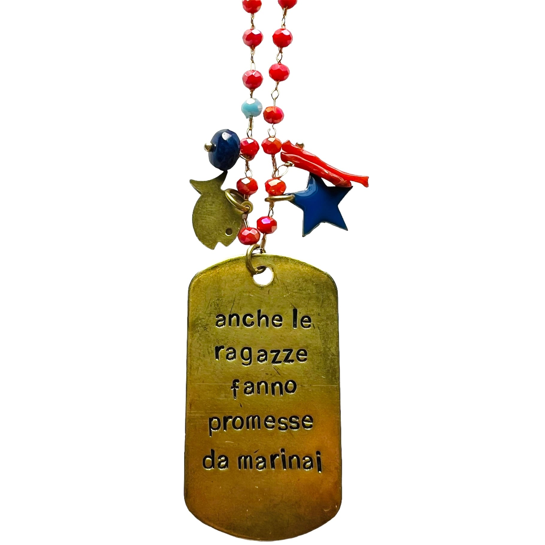 collana lunga MR BIGGY BIJOUX rosario con cristalli rossi, ciondoli marinari e medaglietta incisa a mano "anche le ragazze fanno promesse da marinai"