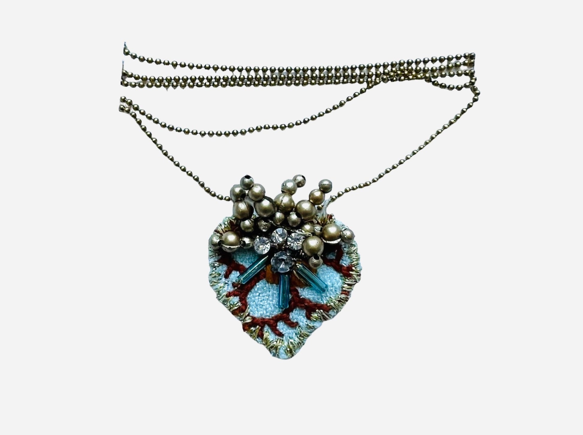 collana lunga PUELLA "cuore petit "con ciondolo ricamato a mano bruciato e oro opaco