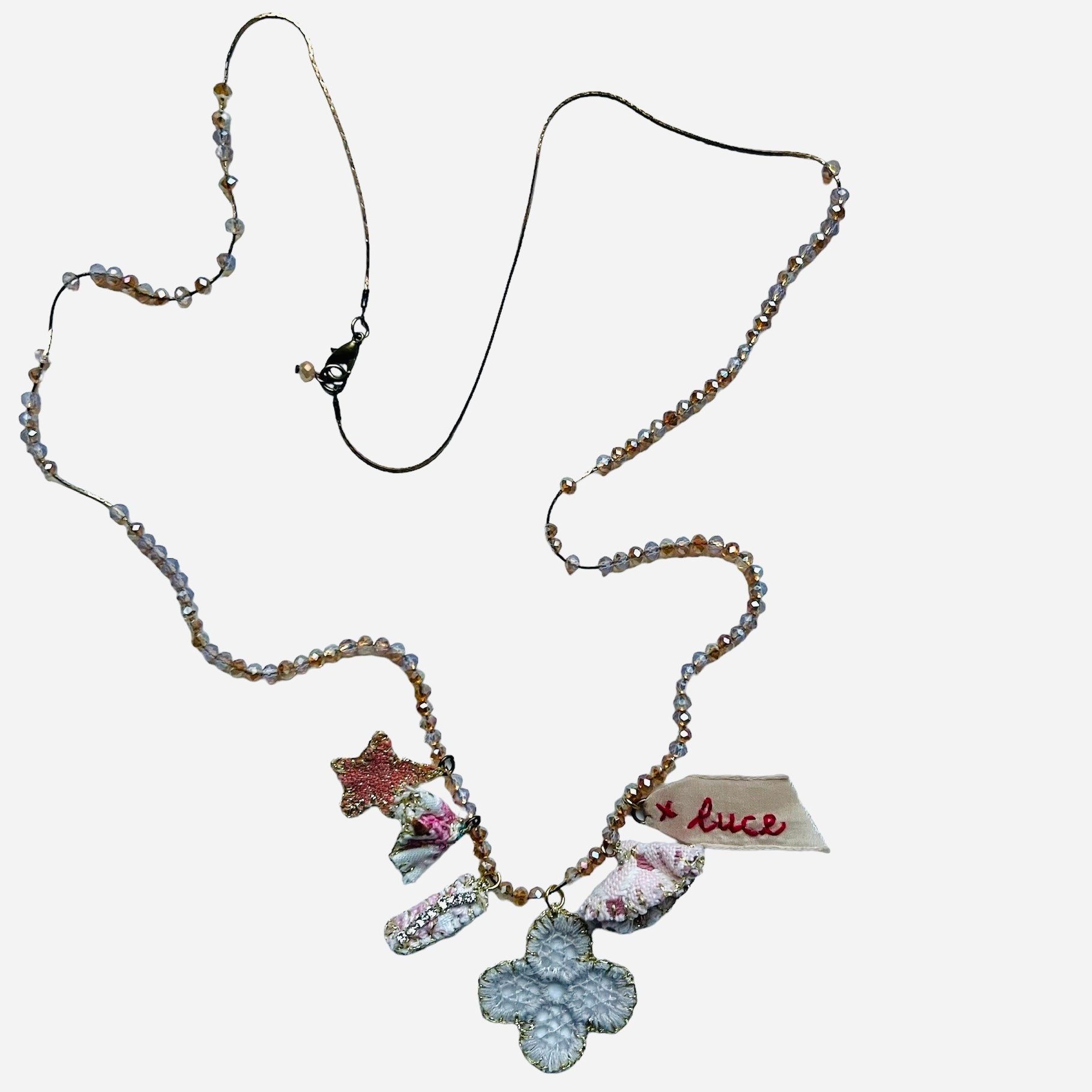 collana lunga PUELLA Fleurette "luce"con cristalli in vetro iridescenti e ciondoli ricamati a mano