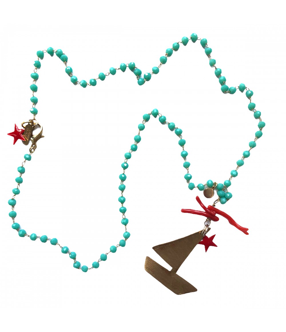collana SABRINA CANZONIERE con ciondolo barca, vero corallo e cristalli turchesi