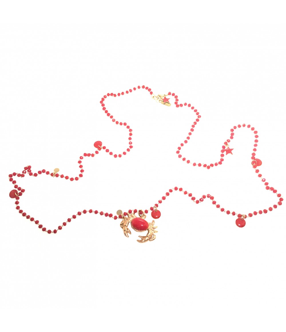 collana lunga SABRINA CANZONIERE con cristalli rossi e ciondolo granchio, pastiglie in smalto e stelline in ottone smaltato