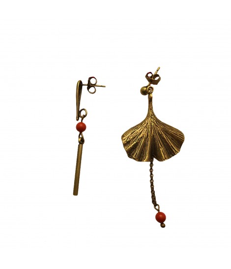 orecchini BARBARA MOGNI spaiati con ciondolo foglia di ginkgo e pasta di corallo