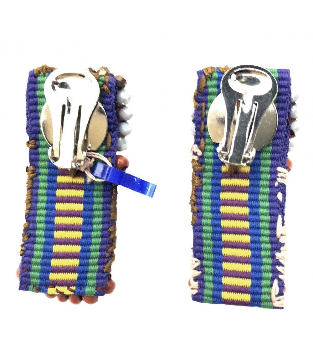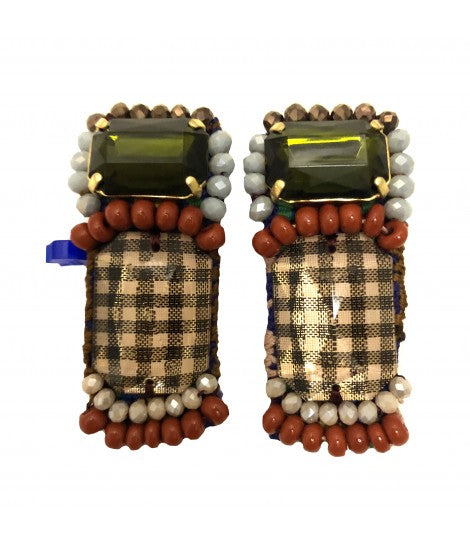 orecchini CHIARA FINI realizzati e ricamati amano con cristalli colore verde militare e bottone vichy
