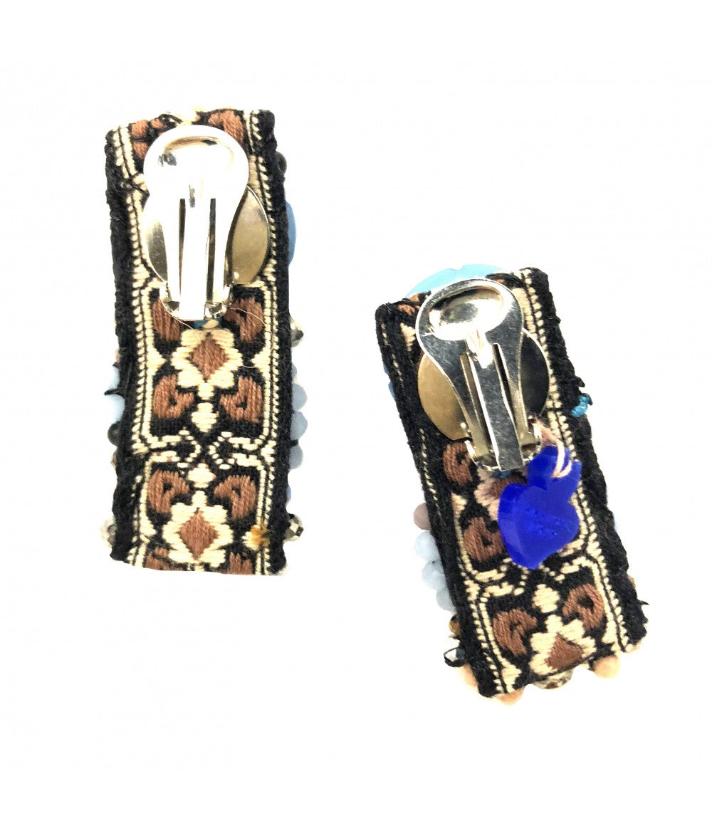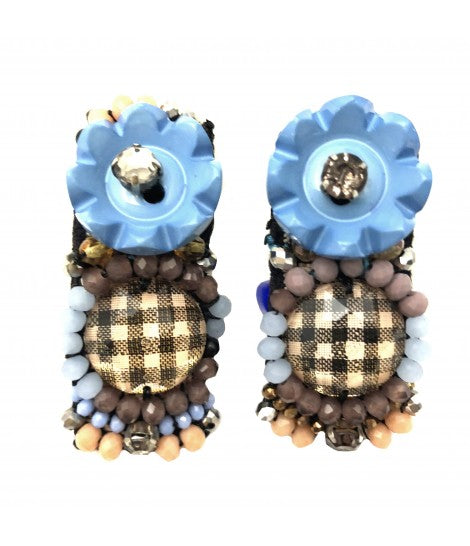 orecchini pendenti CHIARA FINI ricamati a mano con cristalli azzurro lavanda e salmone e bottone vichy