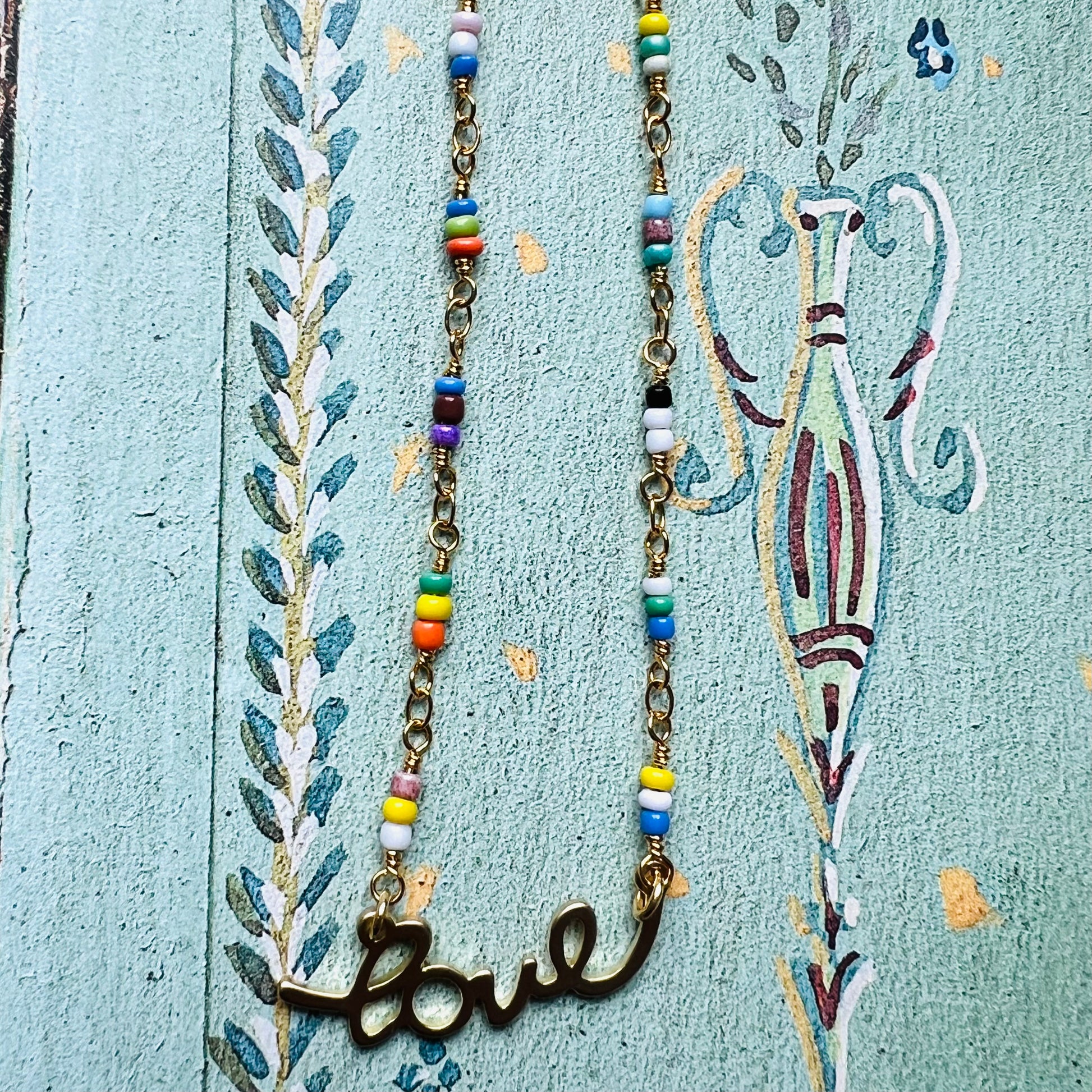 collana girocollo VIOLA PISENTI con inserti in perline multicolore e scritta centrale " love"