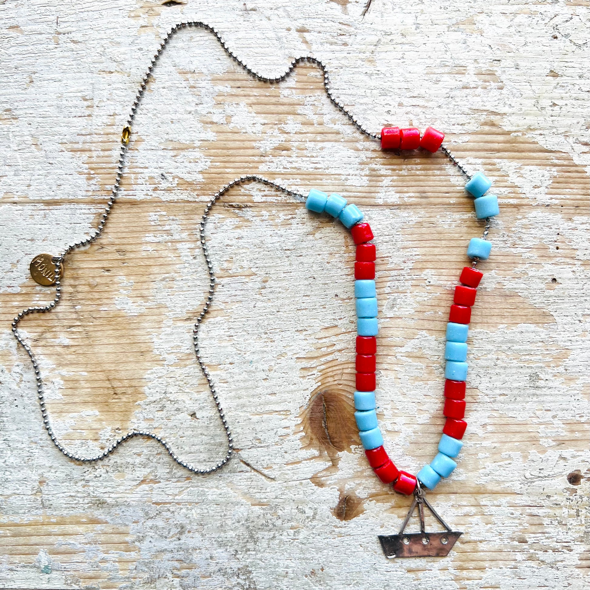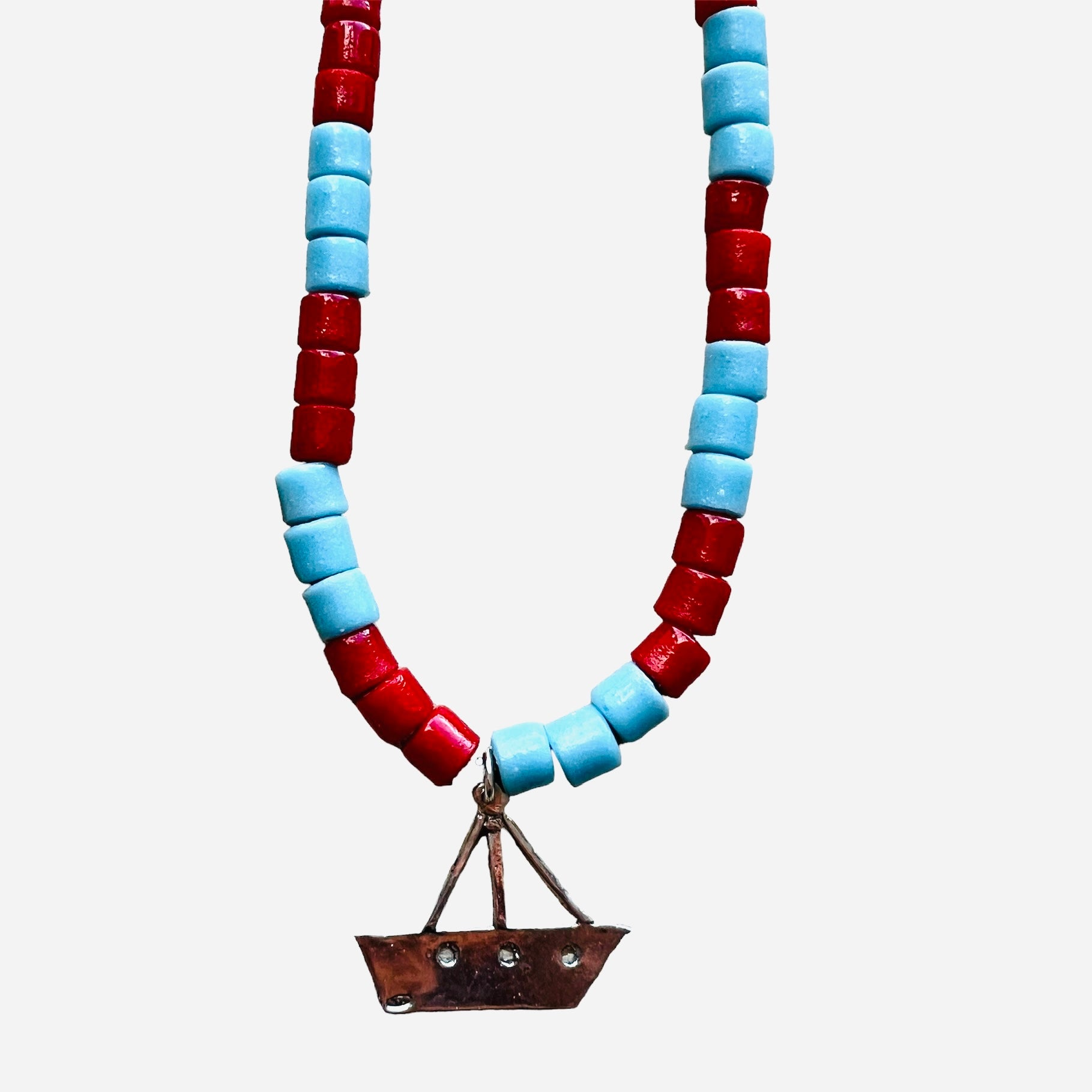 collana MAIDA MONILI maxi perline bicolori rosso e turchese con ciondolo centrale barchetta in argento