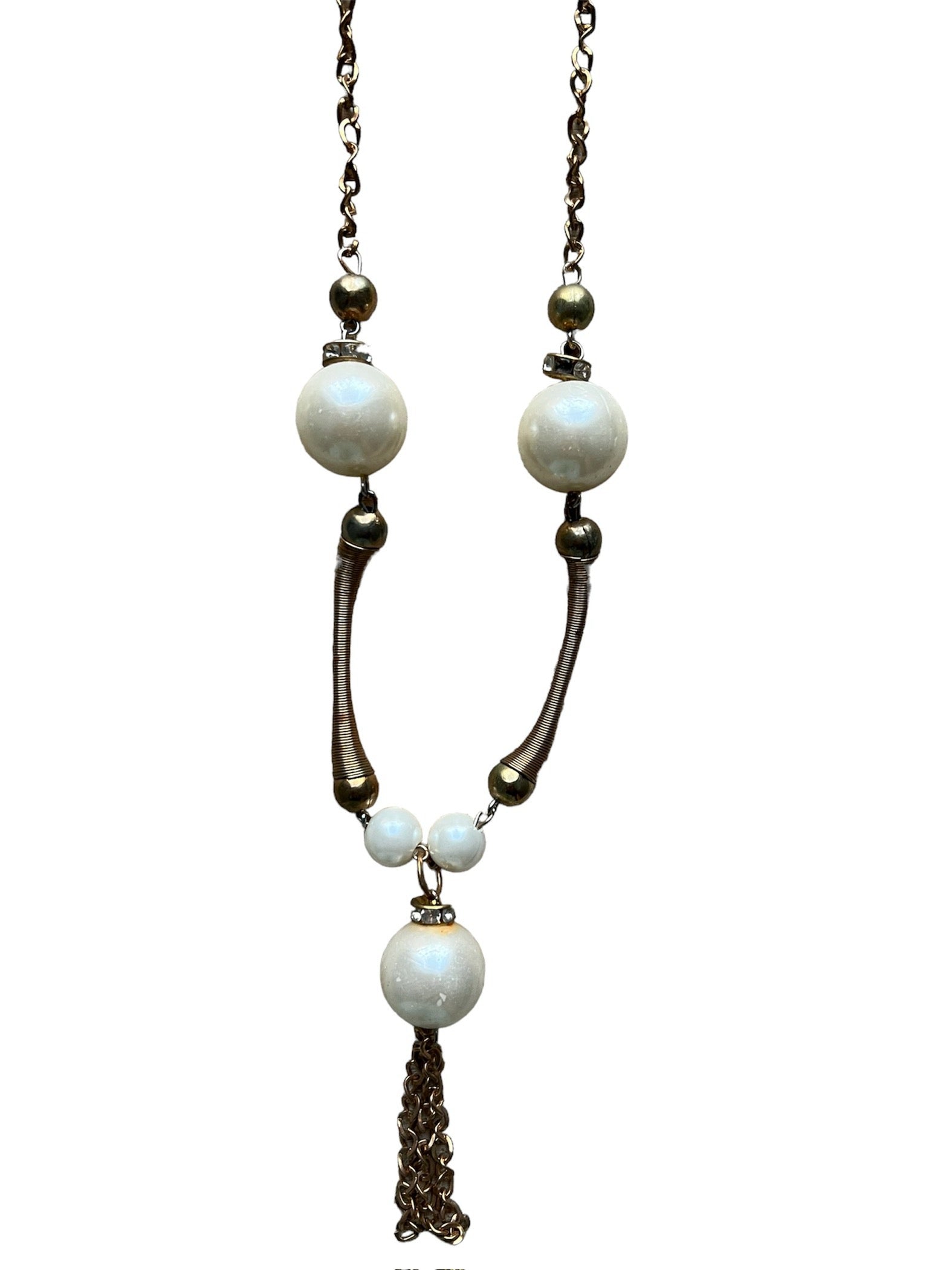 VINTAGE! collana lunga con perle-bijoux ed elementi allungati in metallo dorato