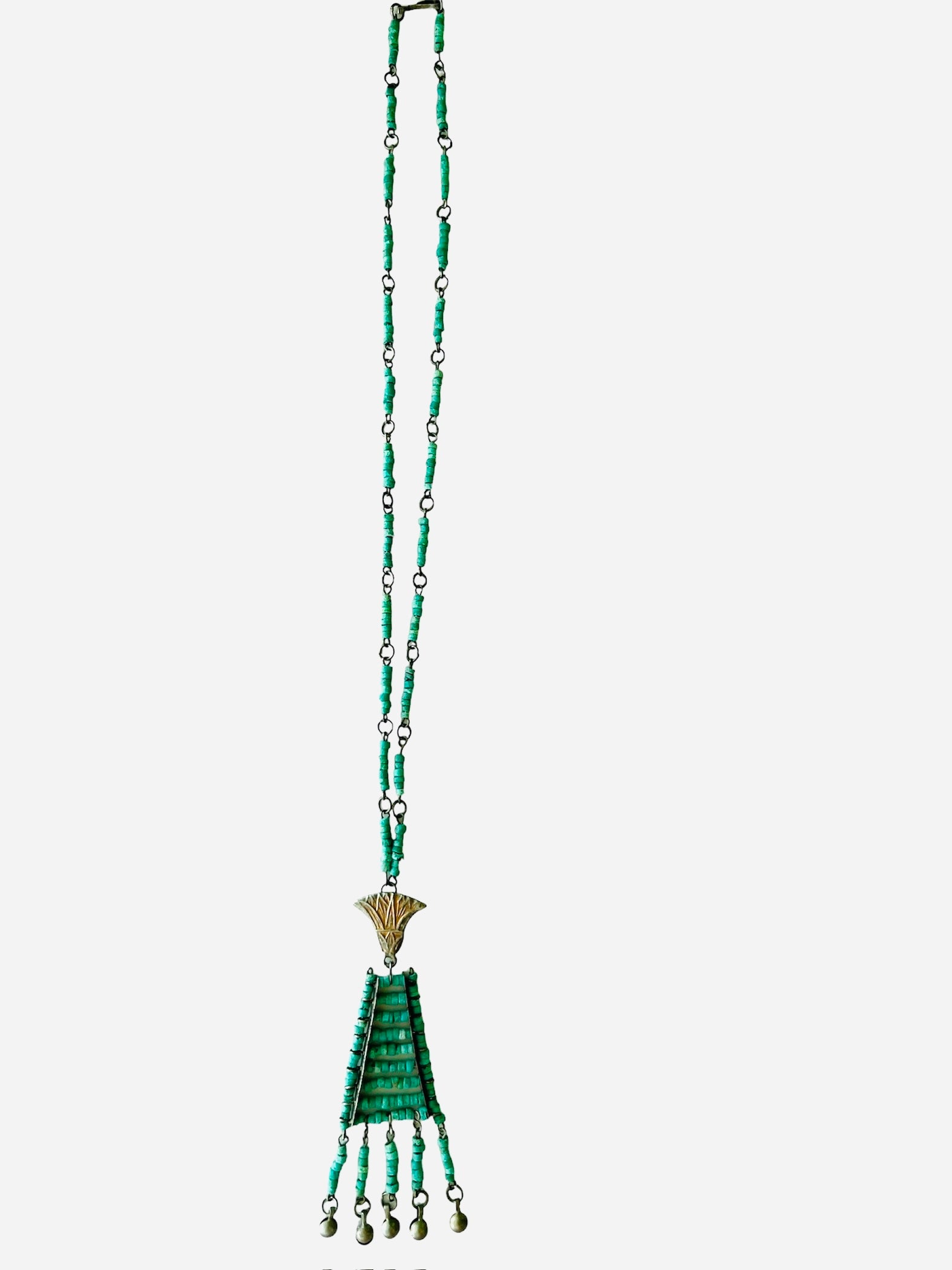 VINTAGE! collana lunga con perline verde mare, elemento fiore e ciondolo finale